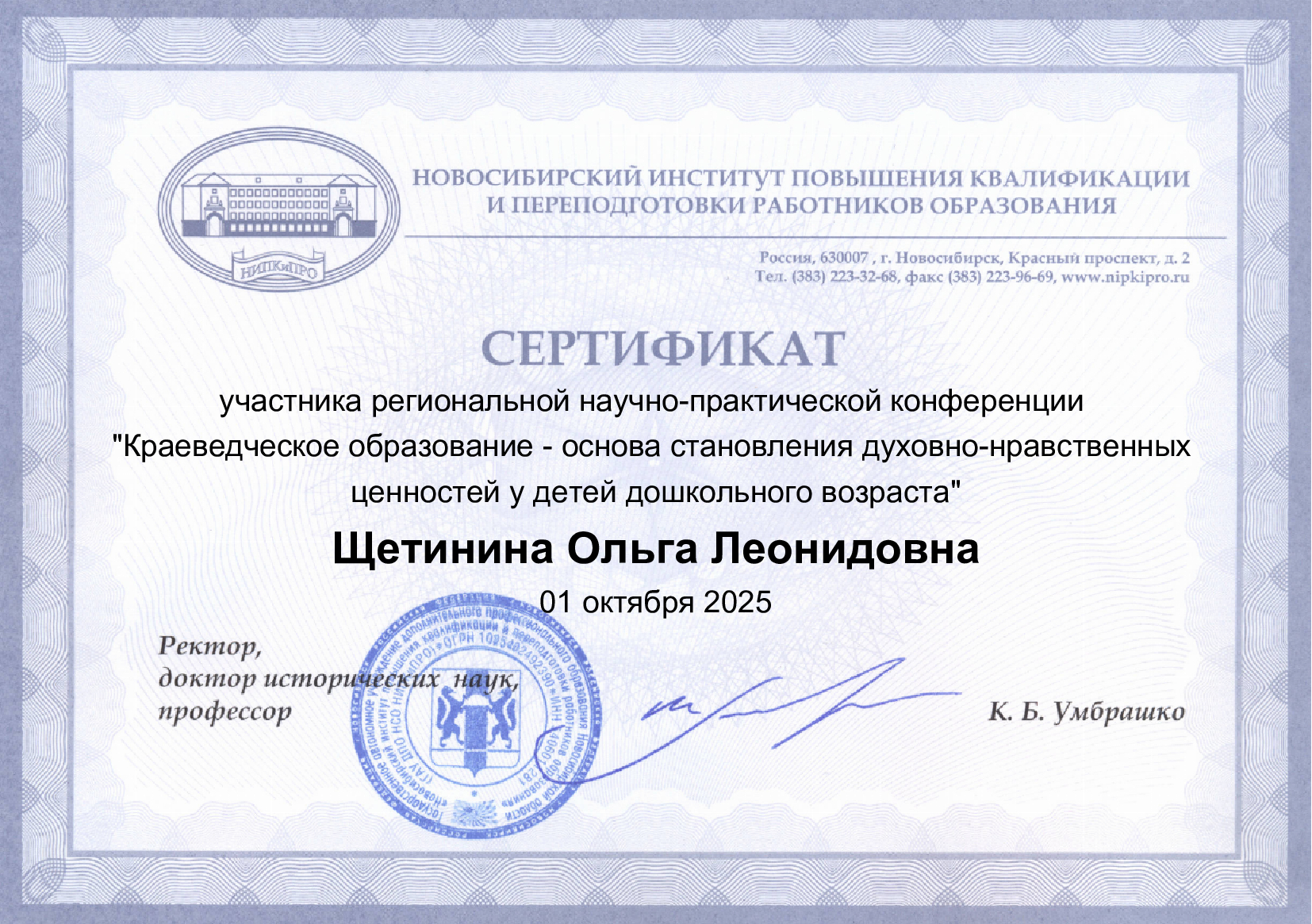 Сертификат участника научно-практической конференции "Краеведческое образование - основа становления духовно-нравственных ценностей у детей дошкольного возраста"